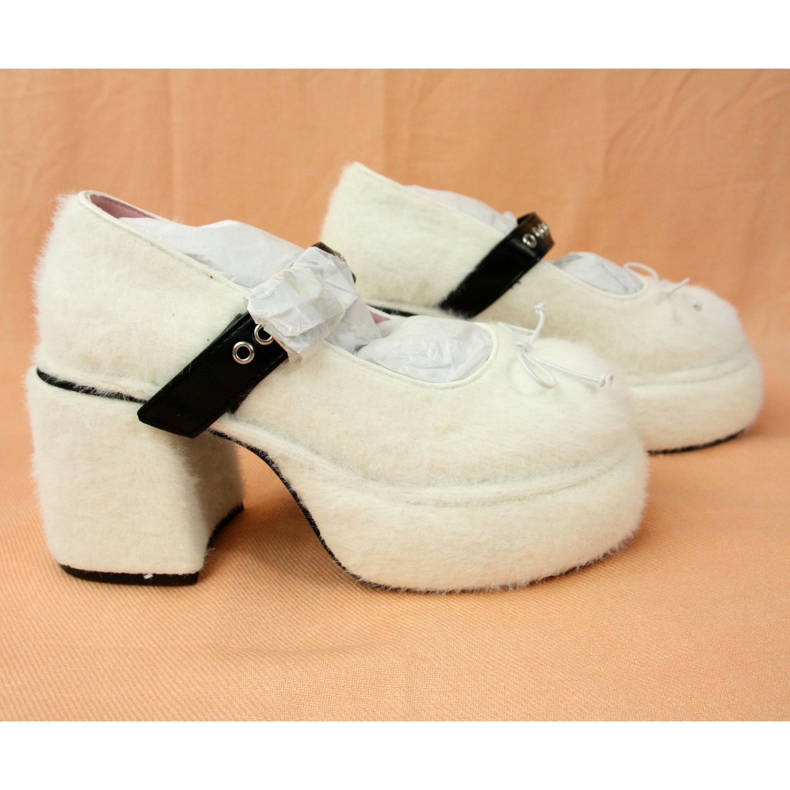 Funky platform boots/mary janes combo from the Dolls Kill Sugar Thrillz line. The color is slightly off-white. Two-piece style, can be worn as boots or as mary janes by removing the calf piece. It snaps under the arch.